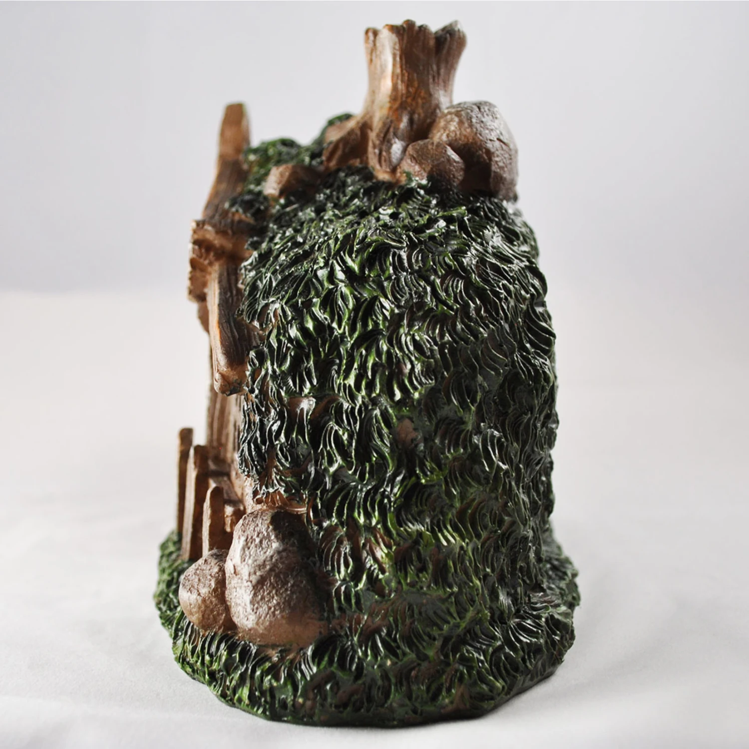 This lovely Hobbit Cottage is lite by LED lights and made from Polyresin so is suitable for indoor and outdoor fairy gardens. Hobbit Cottage would look great under a hedge etc.. this cottage has a cute round blue door and has two windows which light up when you switch on the LED lights.
